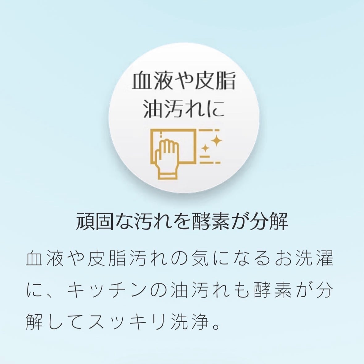 界面活性剤(7%、アルキルグリコシド)アルカリ剤(炭酸塩)、安定化剤(炭酸塩、亜硫酸塩)、工程剤(硫酸塩)、酵素